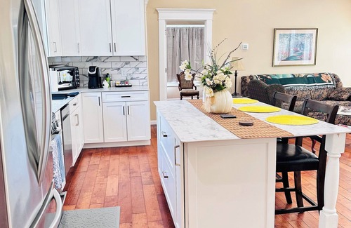 Gorgeous 1-bedroom space open kitchen with island and chairs, spacious living room, and one bathroom. It's vibrantly colored and has high ceilings. It's also within walking distance of Elmwood Village with its wonderful food spots and shops. We are also near Delaware Park and less than 30 minutes from Niagara Falls, and 15 minutes to the mall and major plazas!