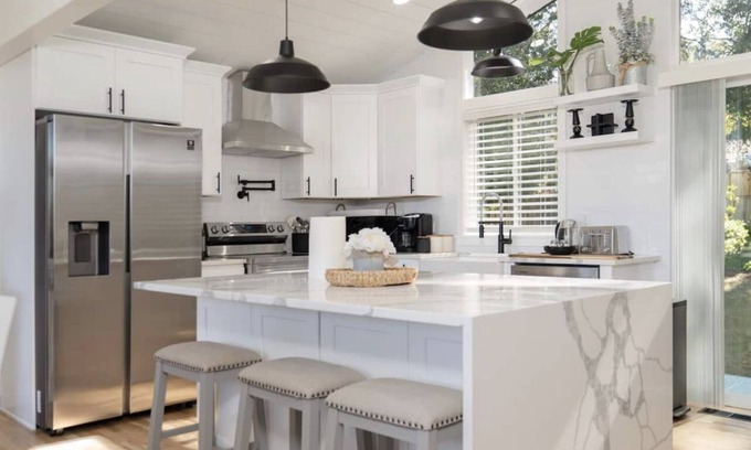 When it's time to turn in for the night, the bedrooms offer sanctuary. The master suite provides an en-suite bathroom with dual sinks and a walk-in shower. The two additional ample bedrooms share a fully updated full bath with a bathtub.