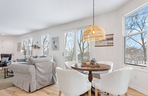 This 4-story getaway boasts 7 bedrooms with 3.5 baths, a spacious kitchen with plenty of room for entertaining or nights of staying in and cooking, 3 dining areas, and an outdoor patio overlooking the harbor. The glassed/screened 3 season room stays cool under the canopy of lovely trees but boasts some of the best lake views. This space can be used as another dining space or an area to enjoy coffee in the morning or watch the sunset over the harbor in the evening with a cocktail. With seven bedrooms and three common areas with pull out couches, the sleep configurations are endless for your large group. The main floor features the kitchen, two dining areas, a large living area with a smart TV.