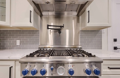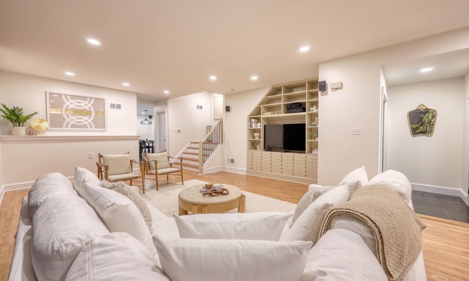 Enter into our large living room with custom built-in shelving, surround sound, and a smart TV. Our kitchen is made for those who love to cook - we have a XL thermador gas range and you’ll find all of the essentials there for your use. We offer a large dining table to enjoy a meal together. Off of the kitchen to the right is the powder room and to the left is a pantry with plenty of storage. Head up the extra wide stair case to the second level where you’ll find a bedroom featuring a queen bed and lots of closet space. Directly to the right of that bedroom is a full bath with a custom Spanish tile shower. Next to the bathroom is a full laundry room stocked with essentials. The last door on your left will take you into our master suite! You’ll have a private bathroom with an XL shower, a double vanity and a free standing soaker tub. You’ll have access to two walk-in closets with a gorgeous bone in lay dressing table. Continue into the master bedroom with a large king size bed, a private gas fireplace, a large bone in lay dresser, and a private over-sized balcony. Head up to our third level where you’ll find yet another large living space with an oversized coach and smart TV. You’ll have a wet bar with a dual-zone beverage fridge. Up here is our 3rd bedroom with a double bed and an en-suite bathroom with standing shower. Continue through the sliding doors to our large rooftop area with plenty of seating to enjoy a meal or a glass of wine to watch the sunset on the couch. This is the best place to relax and enjoy city living with the best location in town.