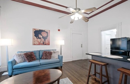 Open living layout with comfortable couch, flat screen smart TV, large windows facing Spruce Street, AC, and a serene stylish design. Leads into a fully stocked kitchen with plenty of cookware, flatware and dishware. Stove top, oven, microwave, toaster, are all provided.