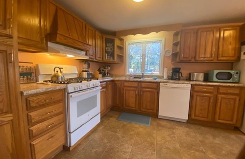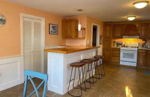 Large eat-in kitchen with built in bar stacked with all your essentials includes a dishwasher, refrigerator with ice maker, microwave, gas stove, coffee maker, Keurig coffee maker, lobster🦞pot, storage containers, mixing/baking pans, grill accessories and spices.