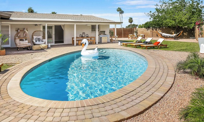 This space is straight out of a dream; filled with upscale amenities, the backyard features a private pool that comes complete with sun loungers & a shaded outdoor dining area. Filled with sunlight and professionally-selected décor, this airy and spacious home is custom-designed for large groups to experience stylish living in Scottsdale.