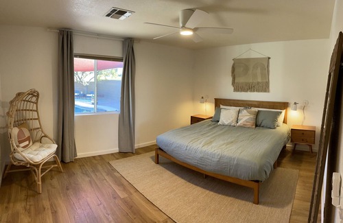 Primary bedroom offers roomy walk-in closet and mountain views. Gorgeous new pool for those hot summer days and a fire pit for those chilly winter evenings! Located near restaurants, backs up to Purple Heart Park, 1.5 miles from the 130 mile Tucson Bike Loop, and 45 minutes from Saguaro National Park.