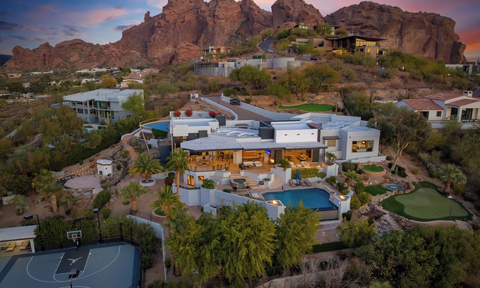 Wander Camelback Canyon is a stunning mountainside estate offering panoramic views and unparalleled luxury. This exceptional property features an infinity pool, spa, and ample outdoor seating, with two pickleball courts, a basketball court, and multiple putting greens for active enjoyment. Inside, the open-concept design includes high-end furnishings, a game room, and en-suite bathrooms for each bedroom. With premium amenities and luxury services, Wander Camelback Canyon provides the ultimate desert retreat for relaxation and recreation.