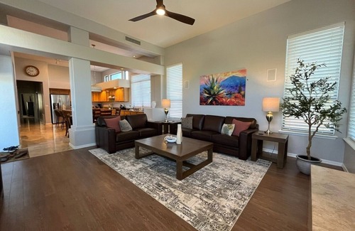 Everyone will have their own space in this home with an open floor plan & 14+Ft Ceilings. The home has 4 Bedrooms/3 Full Baths - 1 King, 2 Queen & 2 Twins for a maximum family size of 6 adults and their related dependent children comfortably. The master bedroom is very large with own sitting area and access to the backyard. The kitchen has a large center Island with 2 chairs and comes equipped with cookware, utensils, pots & pans, cutlery, coffee maker, etc. There is a Family Room & Great Room which are both equipped with a 60' LED TV w/BlueRay and Cox Cable TV as well as a pool table in the Great Room!