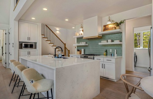Lakeshore Luxe offers four beautifully appointed bedrooms designed for relaxation and comfort. The master suite features a king bed with plush linens, while the additional bedrooms include queen beds. A bonus garage suite offers extra space and privacy, featuring an additional queen bed. With 3.5 bathrooms, the home easily accommodates up to 10 guests, ensuring plenty of space for everyone.
