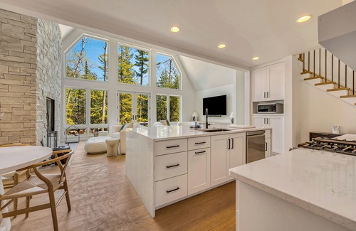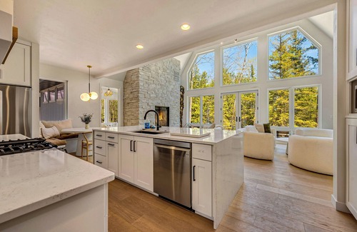 The main floor’s open-concept living area is a welcoming space with upscale décor, high-end finishes, and a grand fireplace that serves as a focal point. Floor-to-ceiling windows flood the room with natural light, showcasing the stunning lake views. The fully equipped kitchen is a chef’s dream, featuring modern appliances and plenty of counter space for preparing meals.