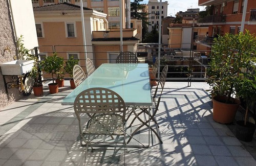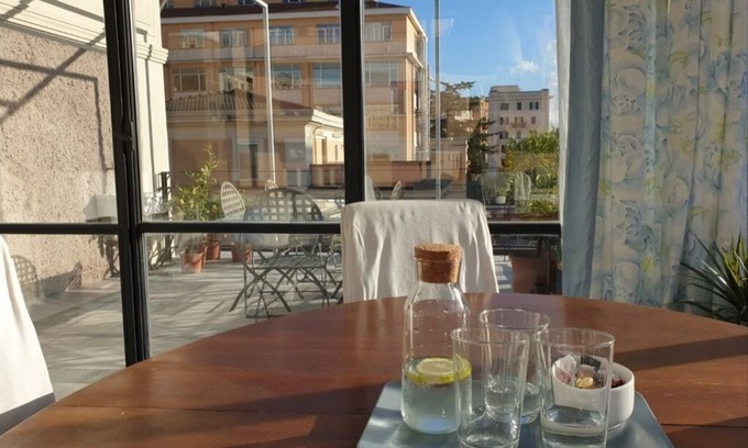 Romantic penthouse with terrace with breathtaking views over the rooftops of Rome. Completely renovated in 2019. Historic building matches with top design and technology, together with all useful domestic appliances: smart TV in each room, a / c, home automation light, coffee machine and kettle. It has two rooms. A study / bedroom with antique tiles exagonal floor, and a veranda with fireplace and terrace; kitchen (with induction stove, oven and microwave oven) and bathroom with walk in shower. In the terrace, with automated irrigation, fountain and barbecue, you can enjoy eatng and sunbathing almost in any period of the year.