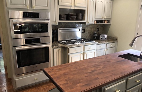 KITCHEN -- The kitchen is chef-ready, including a large wood center-island with sink for food prep. Stainless steel pots and pans, sharpened Henckels knives, Drip and K-Cup coffee makers, Bosch Dual Oven, 5-burner Thermador gas range, fully stocked with appliances and chef's tools. Also many spices and staple items.