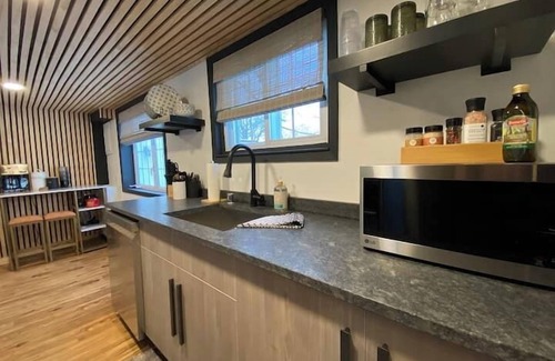 Modern, but not stuffy. The home retains the original character of the large wood beams and living room ceiling, doors and unique half-round door trim. The modern kitchen makes efficient use of space and the coffee bar adds a welcoming and luxurious touch. 3rd bedroom features a sleeper couch and a modern workspace - perfect for working remotely while enjoying your stay. Full bath features tub/shower. Laundry is accessible to guests for your convenience. Front screen porch and large backyard with patio add enjoyable outdoor spaces. Off street parking for two cars.