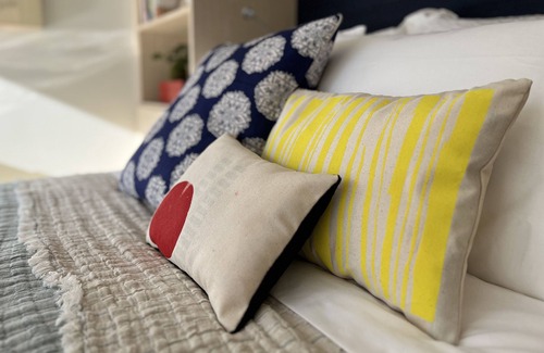A large three panel slider opens to turn the entire suite into an indoor/outdoor space. It is a perfect spot to enjoy your morning cappuccino while you look out to the private south patio garden. The kitchenette has a Delonghi Espresso Machine, a hot water kettle by Fellow, a small microwave and small refrigerator stocked with sparkling water. Lavazza espresso, local teas and snacks are also complimentary. The full bath is clad in deep blue artisan tile. The heated stone tile floor makes the morning even more comfortable.