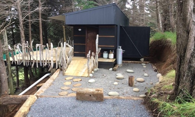 The cabin has been designed to suit a couple who want a private, quiet, relaxing break away from it all. While comfortable and with everything you need, it is a basic, comfortable rustic retreat where you can enjoy some solitude and peace away from the rush of the City. There is no TV, just the distant sound of the sea, the wind in the pine trees and the occasional tui. The cabin has plenty of supplies for cooking and total relaxation...with an exceptionally comfortable King-sized bed and full bathroom. The kitchen is small but well-equipped for cooking meals for two. There is also an outdoor shower to wash sand and salt off after swims. (Note that although we do not supply WIFI, there is a decent cellular signal).