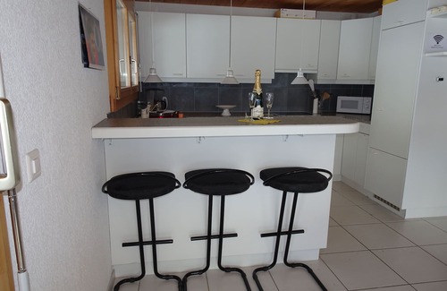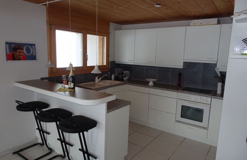 Thanks to oversized windows, the wooden house offers very bright and large cozy rooms with exposed beams. The open kitchen is equipped with every comfort and of course has fondue and raclette accessories. The bar to the dining area invites you to a cozy aperitif. You take your meals at the wooden table with 10 seats. The open spacious living room is furnished with 2 comfortable sofas and has satellite TV, DVD and Dolby surround. WiFi is available throughout the house free of charge.