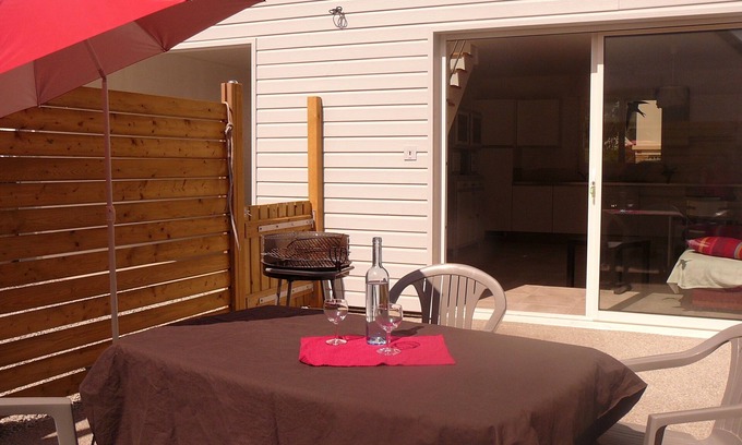 Terrace with garden furniture and barbecue.
