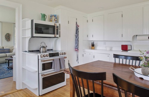 Warm and inviting, this cottage is equipped with all the modern touches; you’ll have that feeling of getting away from it all without having to give up any comforts of home. The well-lit kitchen has a small table by the window overlooking the water. It’s a perfect place to enjoy your morning coffee or play a game of cards. There is a larger table in the center of the room with seating for eight, a refrigerator with an ice maker and water dispenser as well as a cook stove with an oven. You’ll also find a microwave, drip coffee maker, Keurig coffee maker, toaster, dishwasher, blender, and ample kitchen gadgets for whatever you decide to create. In addition, there is plenty of counter and cupboard space.