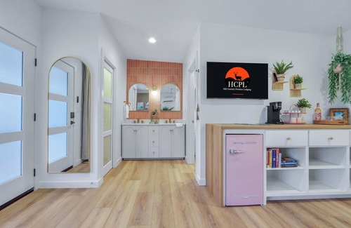 As you step into this elegant suite, you’ll be captivated by its boho glam decor and designer touches. The open-concept layout is both stylish and inviting, with a plush king-sized bed as the centerpiece, dressed in premium linens for a restful night’s sleep. The adjacent seating area features a sumptuous sofa that effortlessly converts into a queen-sized bed, providing comfortable accommodations for additional guests. A wall-mounted streaming TV invites you to kick back and enjoy your favorite shows, while the mini fridge and Keurig coffee bar offer added convenience for morning brews or late-night snacks.