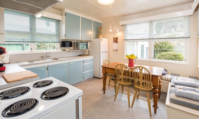 The bathroom has been recently renovated and features a new toilet, vanity and large shower .The laundry is in a seperate room. The property is nestled on a secure north-facing section with good indoor/outdoor flow from the living room to an outdoor deck and garden. Foldaway single bed with mattress and bedding (if required) Guests are asked to NOT to park on the front lawn. Tea, coffee and sugar provided Special conditions: No Parties or Events permitted Smoking permitted outdoors only . Minimum stay two nights No pets please . Extras: Linen (included); NOTE: Under Kiwi bach tradition you are expected to: Clean the house and do the dishes before you leave.