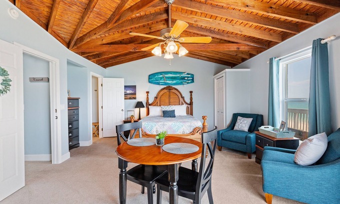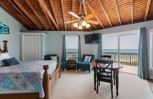 This quaint upper-level room features a stunning wood ceiling and arguably the best ocean view of any unit on the property—perfect for those seeking a peaceful, coastal escape.