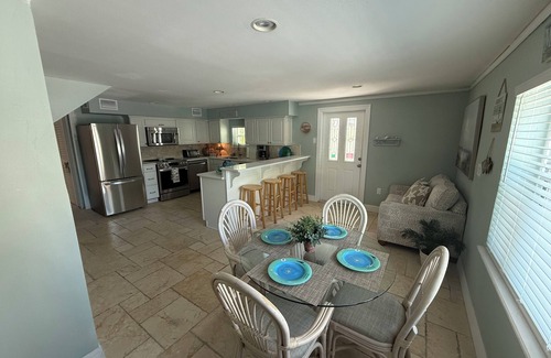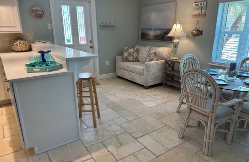 This modern, recently remodeled home has a convenient private entrance leading directly into the kitchen... no elevators to contend with while unloading luggage and groceries! The large, fully-equipped kitchen has a large with stools bar for dining, as well as a table and chairs. A bright, sunny bedroom boasts large twin closets and island-style furniture.