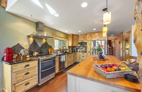 Our house includes; 4 bedrooms with luxury linens, 3 fully equipped baths, a well appointed kitchen, washer/dryer, gas fireplace and stove, heated bathroom floors, and convenient garage parking.