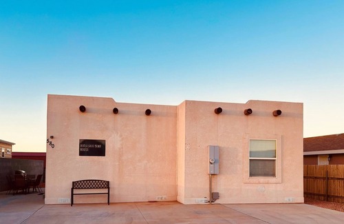 Renovated in 2020 2BD 1BA, sleeps up to 4 adults and 2 younger kids in a tranquil neighborhood on the edge of Page; view of the Vermillion Cliffs from the front; patio table and BBQ plus elevated front porch, minutes from downtown.