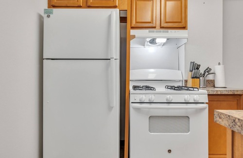 Experience minimalist chic in this modern apartment! Drift off in the queen-sized bed, perfect for restful nights. Tackle tasks at the designated workspace with desk and chair. Whip up culinary creations in the fully equipped kitchen and unwind in the stylish living area, featuring comfortable seating, a coffee table, and a wall-mounted TV for entertainment. The full bathroom offers convenience with a shower/tub combo and vanity. Enjoy a sleek and functional stay!