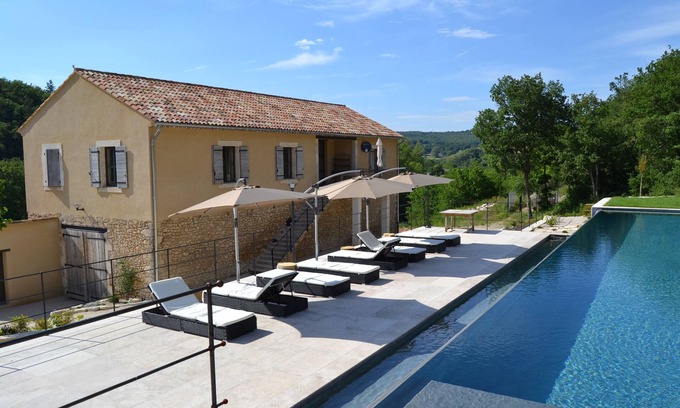The gite has three spacious bedrooms, each with its own shower room and toilet, and a living room with open kitchen. The heated infinity pool and the surrounding terraces are completely private for the guests of the gite. The accommodation is equipped for 6 to 8 people, but if desired, more accommodation is possible.