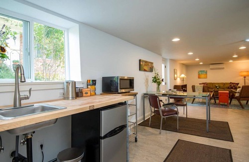 In the lively Southeast Portland area, you'll find this delightful one-bedroom hideaway, perfect for your upcoming break. Unwind in the comfortable living room, where you can enjoy the smart TV and a selection of games and books. The kitchenette comes with microwave, toaster, mini-refrigerator, and hot water kettle and is stocked with coffee and tea to get your first morning in the apartment started off right. The bathroom is stocked with towels and soap. The space has it's own dedicated air conditioning and heating to ensure your comfort. Just a 8-minute walk away, you can explore the SE Division Street District, known for its eclectic shops, cafes, and restaurants. The lively Hawthorne District is a quick 17-minute walk away. For sports enthusiasts, the Moda Center, home of the Portland Trail Blazers, is just an 8-minute drive away, while the Oregon Health and Science University is a quick 6-minute drive. With its convenient location, thoughtful amenities, and inviting atmosphere, this vacation home is the perfect base to experience the best of Portland.