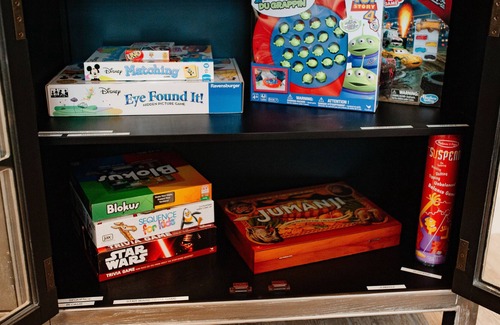 Special touches, like Disney-themed cups and plates for children, a large Disneyland map in the living room, and toys placed throughout the house give this home a magical feel. The upstairs family room includes a Nintendo Switch, a soundbar, Disney themed board games and books, and a USB charging station. There is also access to a Disney Plus account for a day of Disney fun the whole family can enjoy.