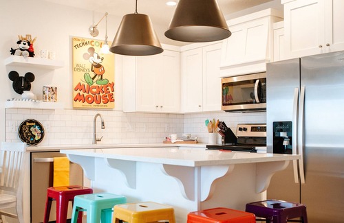 Experience the magic of Disney at this iconic Disney themed townhome. You'll be transported into a Disney park the second you step through the doors at this magical house. With fun decor, bright colors, Star Wars arcade and Disney themed items all throughout, this home will make your Disney dreams come true. Perfect for traveling with man's best friend, this dog-friendly home is the perfect place for a magnificent desert getaway. This house comes with dog bowls, dog treats, and a backyard grass area so your dog can enjoy the vacation just as much as you will!