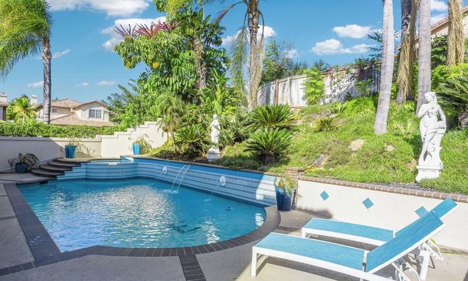 Spacious & comfortable home for family and groups traveling together. 2,500+sqft with 5 bedrooms and 3 bathrooms.. Natural lighting throughout the house and new furnishing for your stay. The custom built backyard oasis boasts heated pool/jacuzzi, built in BBQ Grill, and fireplace. Ample space for entertainment so that everyone can enjoy. Vaulted ceilings in the foyer with a pool table for enjoyment. There is adequate space for everyone. Best location close to restaurants and shopping.