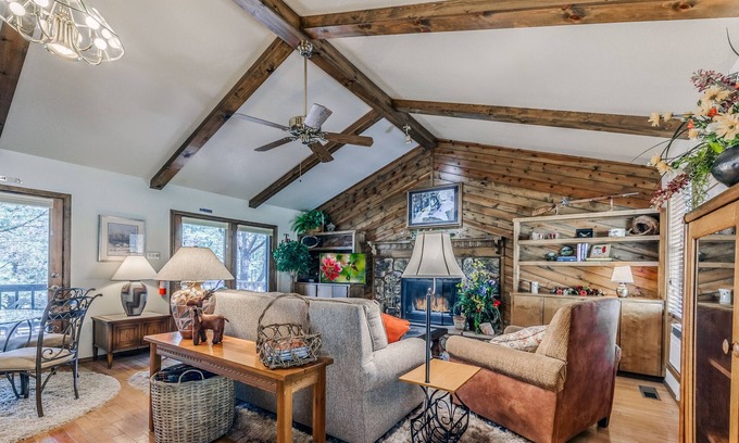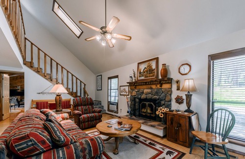 Immerse yourself in a world where adventure meets bliss at Lone Pine, a spacious sanctuary nestled in nature's embrace. This inviting family home yearns for laughter and connections, offering not one, but two high-ceilinged living rooms that beckon you to unite for exhilarating movie nights and spirited game marathons. Settle into the plush seating by the crackling wood-burning fireplace (firewood is NOT provided), where every warm glow invites cherished memories to unfold, ensuring your stay truly feels like a distinct getaway.