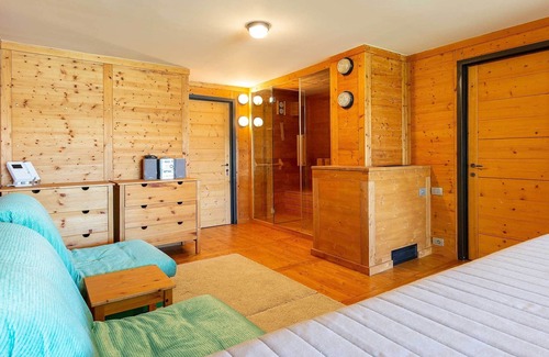 - In this newly constructed area you’ll find a very spacious suite with a kitchenette, table and armchairs, desk, sofa and large TV, and a double round bed from where you can enjoy amazing views over the pool and the lake. Still in this incredible suite you’ll find a bathroom with shower, also functioning as a steam bath, and to top it off a Jacuzzi with floor-to-ceiling windows overlooking the lake. Ultimately there is a room with 2 single beds, with sauna and ensuite bathroom with shower.