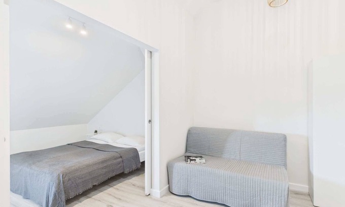 The apartment is a functional solution, ideal for a family with children or a group of friends, comfortably accommodating up to four people. The spacious living room features a comfortable, fold-out double sofa that quickly transforms into a cozy sleeping space for two. A large TV with access to internet television and Smart TV functionality makes movie nights enjoyable. Air conditioning ensures a pleasant coolness on hot summer days, creating ideal conditions for relaxation after a day full of experiences. The kitchenette is designed for convenience when preparing meals. It is equipped with a modern induction cooktop, fridge with freezer, microwave, and electric kettle. There is also a dining table where meals can be enjoyed together. The cozy bedroom is an oasis of peace. It features a large, comfortable double bed, ensuring a restful and rejuvenating sleep. The bathroom has a practical shower and a hairdryer. For the convenience of guests, a washing machine and dryer are available in the shared corridor near the apartment entrance. The apartment also includes a standing clothes dryer, iron, and ironing board, which is particularly useful for longer stays. For families traveling with bikes, bike racks are available in the courtyard.