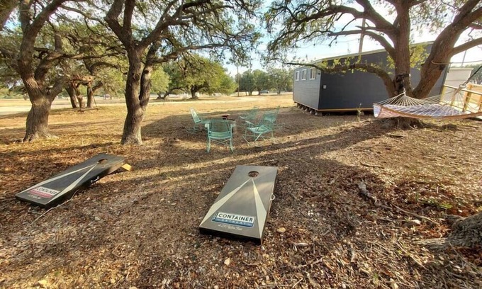 Our 40' containers are arranged in pods of four surrounding majestic oak trees and lush landscaping with just enough ambient lighting to make it relaxing and comfortable. If you want to hang out, just walk over to the common area where you will find open space, chairs, a hammock, and our custom Container Retreat cornhole boards.