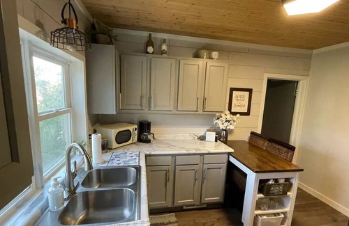 Full kitchen: Dishes, utensils, stove/oven, pots, microwave, coffee, tea, basic condiments