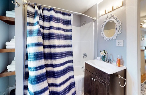 The entire retreat was completely renovated in 2017 with modern appliances and marble countertops and floors, offering the ultimate vacation experience. When it comes to outdoor living, this retreat enjoys a private back porch that overlooks a spacious rolling backyard, a firepit where you can gather for some storytelling while roasting marshmallows, and yard games.