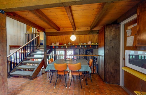 This home has one of the best locations in our opinion! Located on the northwest side of Wallowa Lake, you'll enjoy the day's sun for longer while you sit out in the grassy area! The bedrooms and a bathroom are up a short flight of stairs, and both bedrooms have new king beds. The living and dining rooms are open, both with sweeping views of Wallowa Lake!