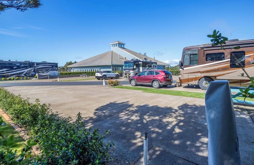 Stay a few steps away from the beach at the beautiful Pacific Shore Motorcoach Resort near Newport, Oregon.