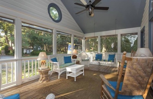 DOG FRIENDLY cheerful, light filled ranch style beach house, just 2-1/2 blocks to the beach. Comfortably furnished and nicely decorated throughout, it is a perfect house for a three- generation family or two family vacation. Two queen ensuite bedrooms, each with its own bathroom and TV (streaming and YouTube tv). Two additional bedrooms one with a queen bed and one with two twin beds with a full bathroom across the hall. Spacious great room and dining area, with high ceiling and suspended fans, connecting to the updated kitchen. Other amenities include a large, comfortable screened porch with ceiling fan and old-fashioned swing, and large laundry room with a full sized washer and dryer. Other features include enclosed yard with outdoor dining area with gas grill and off-street parking for two cars. Two complimentary parking passes for use during your stay.
