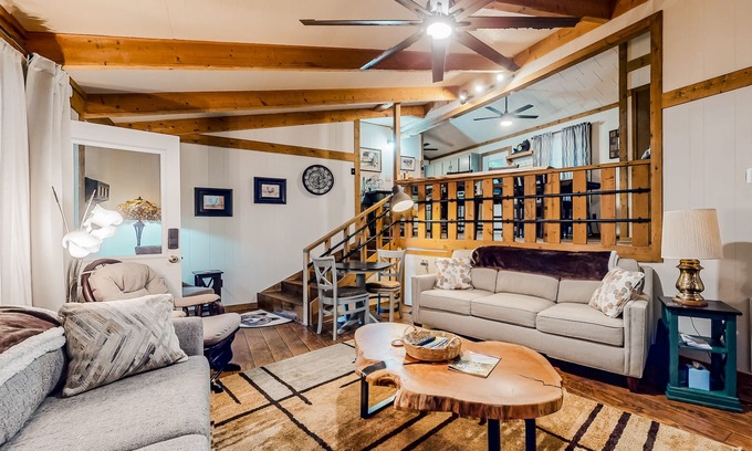 This stunning, sun-filled cabin is artfully decorated with modern finishes and rustic charm. Nestled into the tree line, you’ll enjoy sipping your morning coffee on the balcony overlooking surrounding wildlife or grilling up a hearty meal after a day of backpacking. It also features a well-equipped kitchen, bar seating, and a spacious dining area where everyone can gather. Fire up the wood stove, snuggle up in the large living area, and stream your favorite flicks for family movie night. Or perhaps, after a long day of expeditions, draw a bath in your en suite bathroom, and recline with a glass of local wine while stargazing on the patio. The wood paneled interiors and exposed beams of this home ensure the inside is just as beautiful as the outside for the entirety of your unforgettable stay.