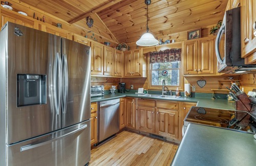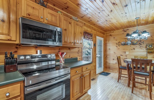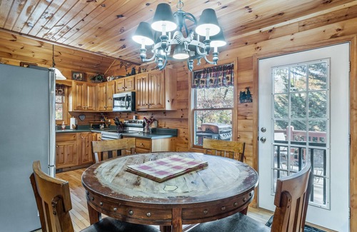 Find more space to unwind in the cabin's living area, outfitted with a gas fireplace and a TV. Downstairs, you'll find another TV and an electric fireplace, as well as a foosball table and an air hockey table that provide added entertainment. Channel your inner chef in the well-equipped kitchen. When it's time to eat, break bread together at the dining table. Additional perks of this cabin include a washer/dryer, central air-conditioning, and high-speed WiFi.