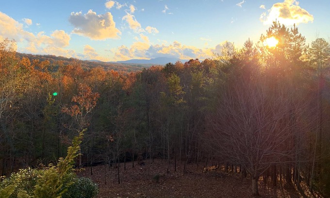Tucked down a private drive in the woods of the Blue Ridge mountains is the serene LaVista. Drive down southern country roads through Morganton, turn right at the giant willow tree, and wind your way to this private cabin set on four acres with views of the lower Appalachian mountains from every bedroom. 3 porches + two screened (one private to upstairs bedroom!). Two living rooms with their own fireplaces & TVs, plus a hot tub for 6! 3 bedrooms w their own separate bathrooms (1 per level).