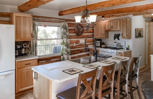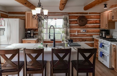 The interior is classic in every sense, from the natural log walls to the textiles inspired by the American West. Yet you'll also be treated to every modern comfort, including a well-equipped kitchen with a breakfast bar, a smart TV to watch in the warmth of the gas fireplace, and a private washer/dryer to refresh your hiking clothes nightly. In the evenings, gather with your loved ones beneath the rafters and set up your favorite board games at the game table.