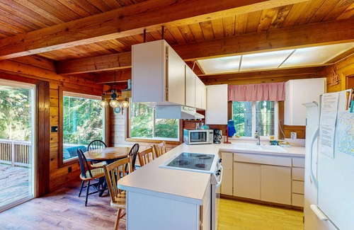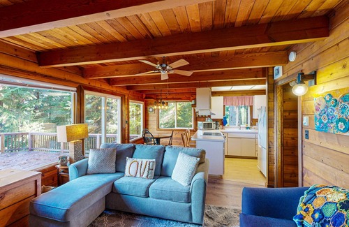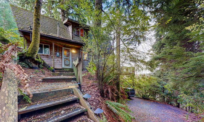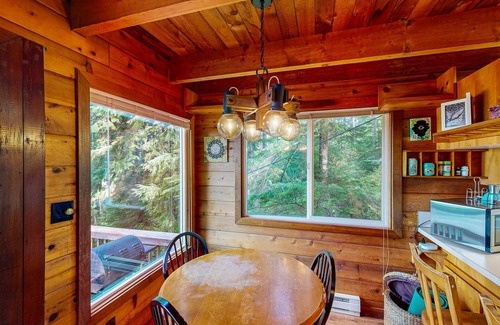 Enjoy the cozy atmosphere of this cabin on the Oregon Coast. Nestled in the woods with an ocean view from the deck, this cabin is the perfect location for someone who want to spend time in nature. In addition to the ocean view guests have a view of Devil's Lake and will be in close driving distance to shops and restaurants. This home boasts a living room with a wood stove, a full kitchen for making tasty meals, a spacious furnished deck with a grill, and a family room complete with a TV, DVD library, and a plethora of board games. Additional perks include a washer/dryer, and high speed WiFi.