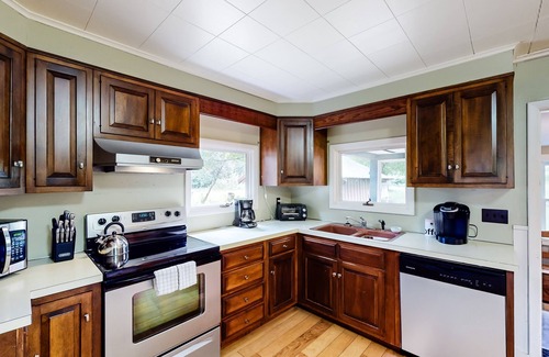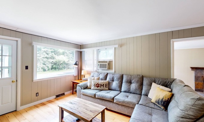Inside this single-level vacation rental, discover a well-equipped, full kitchen for making meal prep a snap, an accommodating dining table for dinners or game nights, and a living area with a plush sectional, a wood stove, and a TV for streaming all your favorite channels. This space is also home to a fireside workstation with a monitor for setting up your laptops.