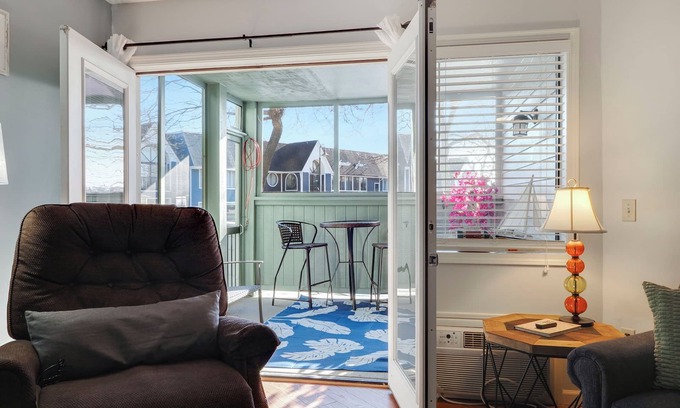 This beautiful condo boasts ceiling fans, wood floors in the living areas, tile throughout the bathroom, beautiful carpet in the bedroom, and an updated kitchenette. The bedroom provides a king-size bed, a smart tv, an oscillating fan, and additional outlets with USB ports. Additional sleeping space is a queen-size sleeper sofa and an ottoman that converts to a twin bed in the living room. The bathroom has a walk-in shower with a removable shower handle, a movable shower chair, and grab-bars in the shower and by the toilet for easy accessibility. The living area contains a built-in countertop, plenty of storage, a mobile kitchen island with a full-sized fridge, coffee maker, microwave, toaster oven, electric dual grill/skillet, and crockpot for cooking. You will also find a hightop four-person table, a comfortable electric chair, it rises to assist with standing or sitting, and a 50" smart television. Through the french doors in the living room, is a private screened-in patio space with seating for four and a view of the bridge. In addition to the luxurious amenities in this unit, there are board games in the closet for guests to enjoy!