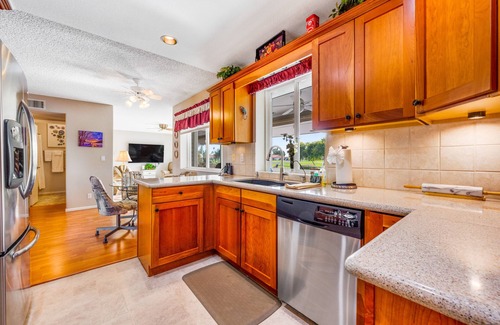 Prepare anything from your morning coffee to full-course dinners in the well-equipped, full kitchen with stainless steel appliances and then dine at the adjacent table or outside on the patio. After exciting days out, kick back and relax in one of two living areas including a front room with cinema-style seating and a large TV for streaming your favorite channels. The rear space offers a second TV, comfortable furnishings, a desk and chair for your laptops, and a golf course view.