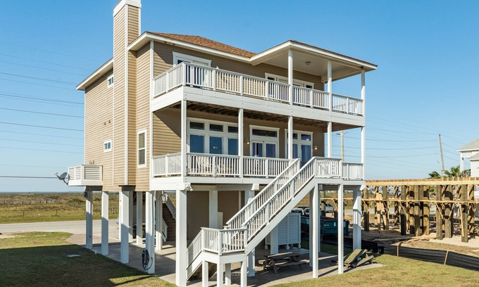 With plenty of room for an extended family or large travel group, this exquisite, beachfront home is sure to be the repeat vacation location. Offering jaw-dropping, panoramic views, coastal chic touches, and plenty of space for everyone to spread out and relax, this home is a Galveston paradise. Prepare full-course meals in the bright, full kitchen while watching the pelicans pass by. Dine together at the large table with seating for 10, with overflow seating at the island, and then gather in the open living area for socializing or movie nights. Outside, you'll find an enormous, fully-furnished covered deck, an upper-level balcony, and a lower level with plenty of picnic tables for warm-weather cookouts. For sleeping arrangements, this home features four comfortable bedrooms ranging from elegant king suites to a kid-friendly space with built-in bunks.
